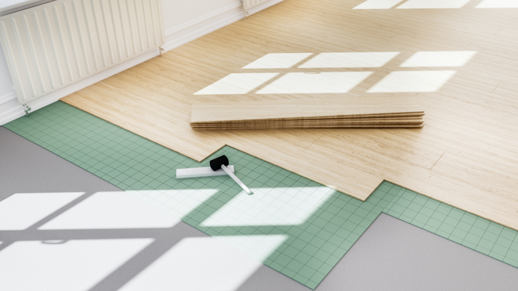 Verlegung einer Vielzahl von Bodenbelägen, darunter Holz, Laminat und Fliesen.